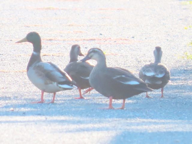 「園路を歩くカモ」発見! カルガモとマガモでした。