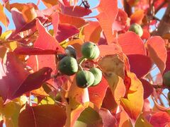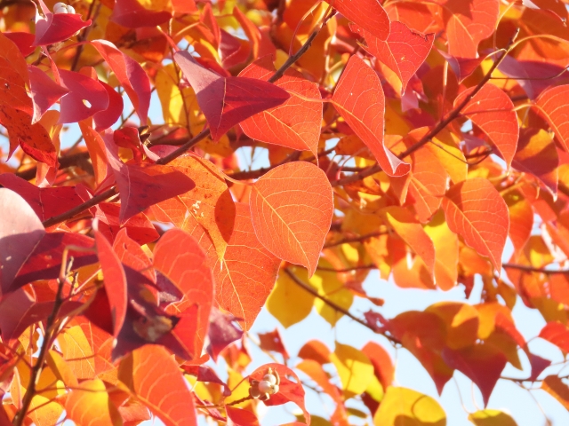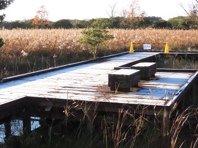 淡水池とヨシ原の間にある「トンボロード」の「ナンキンハゼ」の紅葉が見頃を迎えています。