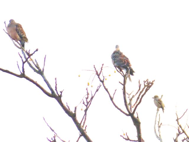 今日はすぐ傍にキジバトより小さい鳥も止まっていました。